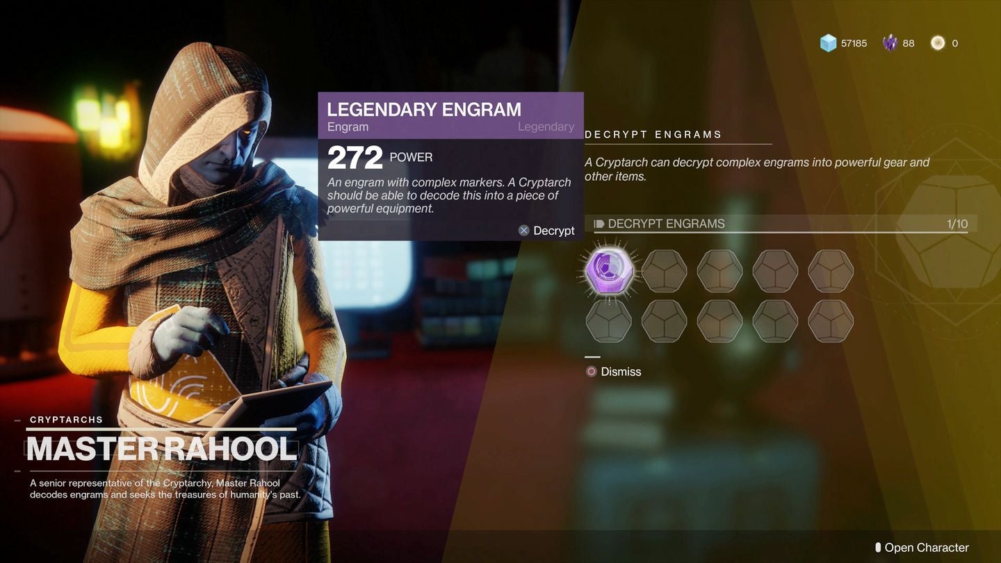 - Bright Engrams aren't opened at the Cryptarch, but at cosmetics vendor Tyra Karn. I guess the idea is if you didn't like your free cosmetic drops, the ability to buy more with premium currency Silver is right there.